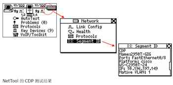 他带了一些日常网络工具到了用户的办公室,首先看看是否有网络连接脉冲,通过计算机的桌面上的网络连接小图标,确认计算机不能拿到IP地址。他再拿出福禄克的NetTool网络万用表来检查,很快报告计算机和上游交换机之间的连接是10兆全双工,输出和输入线对都没有问题。但显示出在DHCP工作过程中,没有得DHCP服务器回应,拿不到IP地址,而且没有多少协议能从交换机发送到用户的机器。网管员正在奇怪为何如此时,想起了NetTool刚升级后新增的CDP发现功能。CDP是所有思科交换机和路由器默认使用的专用协议。通过对CDP的分析,NetTool可以知道连接到最近的一台交换机名称、端口号和所属的VLAN号。