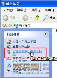 要想和对方共享文件夹必须确保双方处在同一个共作组中。如图1,进入“网上邻居”,单击左侧的“设置家庭或小型办公网络”。