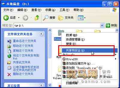 如图6,打开资源管理器,右击需要共享的文件夹,选择“共享和安全”命令。