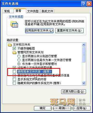 在“文件夹选项”对话框中,如图11,去除“使用简单文件共享”选项的选择。