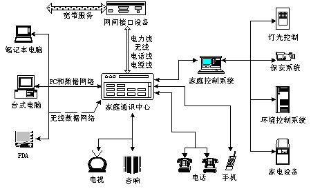 6) 无需维护的运行:整个家庭内各种设备都连接到其网络上,通过网络上运行的管理软件,可实现对设备的监测和故障诊断功能。一旦出现故障,家庭管理系统会给出故障提示,并自动通过家庭内的网间接口设备向设定的相应维修单位保修,无需主人亲自动手;