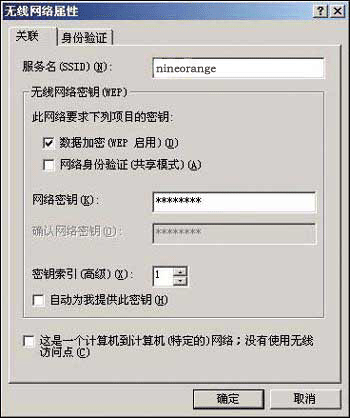 接下来先点击“属性”,将“数据加密(WEP启用)”这一项激活,然后在下面的“网络密钥”和“确认网络密钥”两栏填入刚才设置的加密字串,点击“确定”完成,此时,无线网卡就能够与无线网络节点正确连接了。