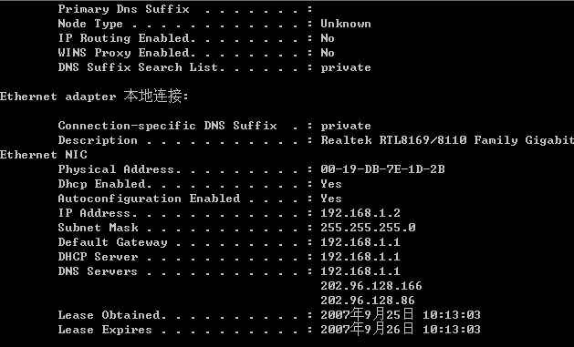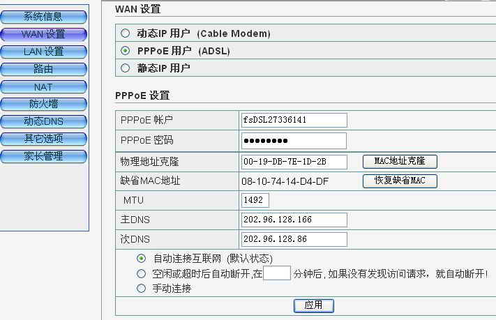图 4 左边栏会有九个选项.(系统设置,WAN设置,LAN设置,路由,NAT,防火墙动态DNS,其它选项,家长管理) 点击WAN设置,(以PPPOE为例),填上自己的帐号和密码.不知道的可以向安装部门索取(一般会在安装时给的安装盘的背面写有)及MAC地址克隆(此项主要是为了应对ISP将帐号和网卡MAC地址绑定的,克隆MAC为可上网电脑的真实MAC地址),及DNS主辅项.(DNS添加到这里可以省确各个电脑上单独再添加DNS的麻烦) MAC地址及DNS主辅项可以在你的电脑中直接查询.运行cmd后,执行ipconfig /all,可以获得这些参数