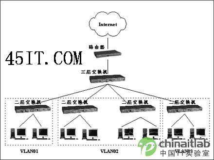 在普通的小型企业中,采用路由器方式划分VLAN是一种节约成本的方法,不过在大中型企业中,采用路由器方式划分VLAN会严重影响企业网络的性能,而VLAN间的通信必需通过路由才能实现,因此,具有路由功能的三层交换机被广泛应用于大中型企业VLAN网络中。但我们必需清楚一点,就是采用三层交换机的VLAN网络同样需要路由器,只不过路由器只是企业网络和互联网的连接工具,VLAN间的通信不会靠路由器来实现。