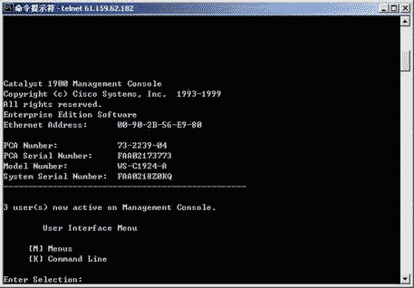 如果交换机运行的是Cisco Catalyst 1900/2820企业版软件。你可以通过命令控制端口(command-line interface CLI)来改变配置。当进入配置主界面后,就在显示菜单多了项”Command Line“,而少了项”Console Password“,它在下级菜单中进行。