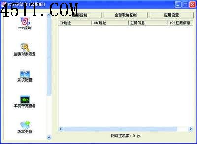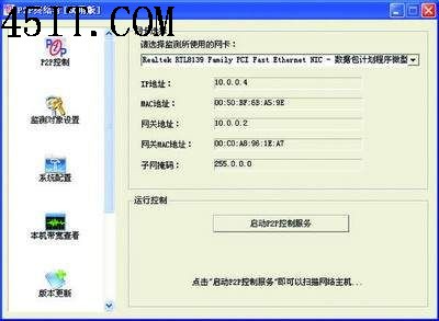 1.在“P2P控制”面板中选择监测使用的物理网卡,如果有双网卡,请选择内网网卡,设置完成后点击“保存配置”保存数据,然后点击“启动控制P2P服务”按钮,首先软件会扫描网络内的主机,并把主机信息显示在“监测对象设置”页面中。