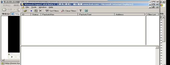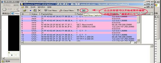 这个时候就进入非常关键的步骤了,现在切到浏览器“在线播放”窗口,点击网页内播放器的开始播放按钮,一旦出现视频正常播放的界面就马上按停止或者马上切到WSockExpert界面,按WSockExpert右上角的“暂停/开始”按钮。停止信息包的捕获。如果你的动作不够快,你的WSockExpert里面将有一大堆你不需要的数据包。其实我们一点“播放”播放器就会向站点请求媒体的地址,获得地址后就开始传输媒体了。所以这步很关键,我们一定要及时的在播放器得到地址后马上停止数据包的捕捉。WSockExpert只会保存一定数量的数据包,新的数据包会覆盖旧的数据包(其实只要找到WSockExpert目录下的WSockExpert.ini配置文件,将其中的默认MaxPacketCount=100修改为MaxPacketCount=5000等即可)。