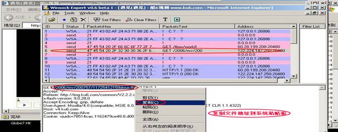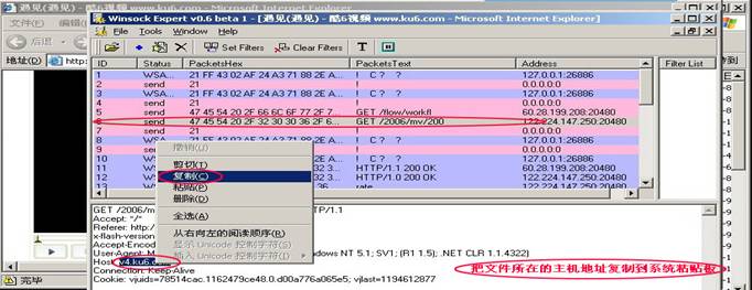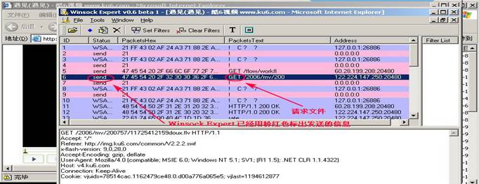 我们需要分别点那些粉红色的发送出去的带有“GET”的数据条目查找我们需要的带有后缀“FLV”的地址。(如果你要找的是音频的或者其他视频格式的请更换思路,常见的音频有WMA,MP3,MP2,WAV。而视频有WMV,RM,RMVB,FLV,AVI,MPEG等,如果你熟悉后,一看到播放器基本就能确定媒体的类型了,接着就是在WSockExpert中找相应地址即可。)