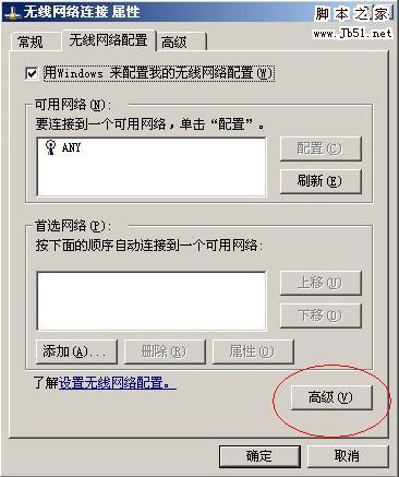 在打开“无线网络连接属性”后,选择“无线网络配置”一项并单击右下角的“高级”按钮,如下图。