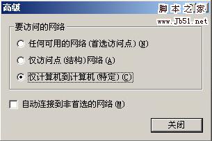 在弹出的小对话框中,选择“仅计算机到计算机(特定)”,并且不要勾选“自动连接到非首选网络”,否则当附近有多个“接入点”时,计算机会按照首选网络的排列顺序自动建立连接。