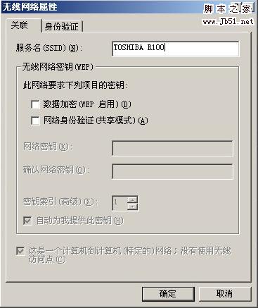 接下来要给这个无线局域网命名,以便其他计算机连接时好区分。这个名字相当于AP中的“SSID标示”,在“虚拟AP”中同样重要。在“无线网络连接属性”中单击“添加”按钮,即可出现“无线网络属性对话框”,如图4所示。这里笔者添加的是“TOSHIBA R100”。
