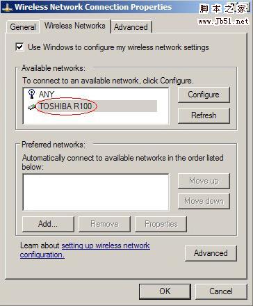 接下来配置无线接入虚拟AP的“客户机”(ThinkPad T41)。首先也应将T41的无线结构设置成“仅计算机到计算机(特定)”,然后回到“无线网络配置配置”界面,单击“可用网络”中的“刷新”按钮。这时,“TOSHIBA R100”的SSID标示边出现在列表中,选中它并单击确定,T41与R100便完成了Ad-Hoc结构无线局域网的连接。若此时还有其他计算机要加入,设置步骤与T41相同,只需稍加更改IP地址即可