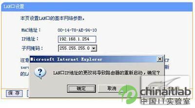 笔者的TP-LINK WR641G无线路由器,默认LAN口地址是192.168.1.1,为了防止他人入侵,笔者把LAN地址更改成为192.168.1.254,子网掩码不做任何更改。LAN口地址设置完毕之后,点击“保存”后会弹出重新启动的对话框。