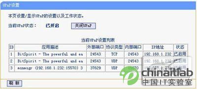 UPnP设置:UPnP通用即插即用是一种用于PC机和网络设备的常见对等网络连接的体系结构,尤其是在家庭网络中中。UPnP以Internet标准和技术(例如TCP/IP、HTTP和XML)为基础,使这样的设备彼此可自动连接和协同工作,从而使网络(尤其是家庭网络)对更多的人成为可能。使用无线路由器上网的机器,使用BT、MSN及一些软件时,通常需要打开一些端口,如果关闭了UPnP,BT下载速度会变慢,MSN视频聊天无法正常使用。为此,用户要想保障互联网应用的正常运行,必须启用UPnP设置。