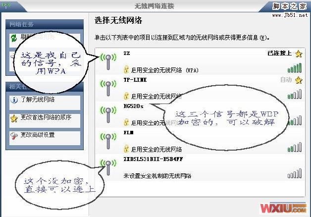 前言:面对电脑搜索到的无线网络信号,你是否怦然心动?但看到一个个“启用安全的无线网络”你是否又感到有一丝遗憾。本人作为一个心动+遗憾的代表,充分发挥主观能动性,总算学有所成,终于能成功无线密码,这份成功的喜悦不敢独享,写下该篇教程。