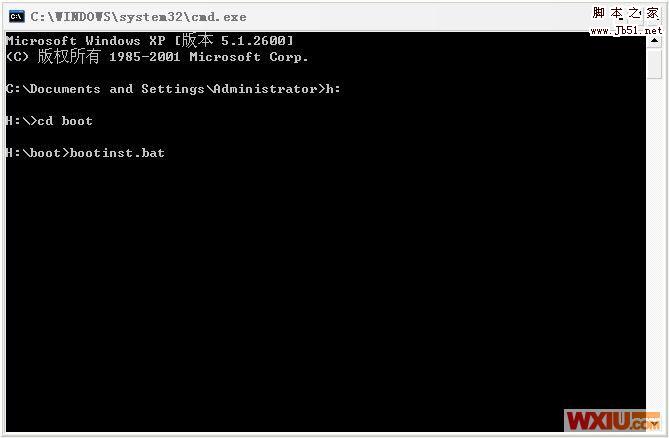 首先输入你优盘的盘符,我这里是h盘,输入h: 然后回车,接下来输入 cd boot 回车,进入到boot文件夹下,最后 bootinst.bat 回车,就会开始安装BT3,如下图: