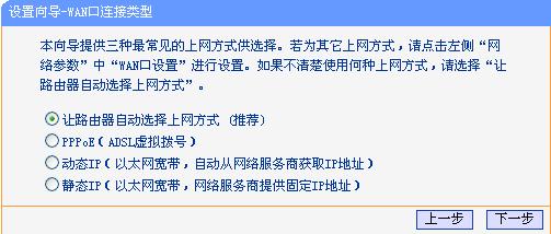 步骤4:根据前端宽带线路来决定选择上网的方式,若不清楚可选择推荐项。一般如果是用帐号密码的就是属于PPPOE类型的。
