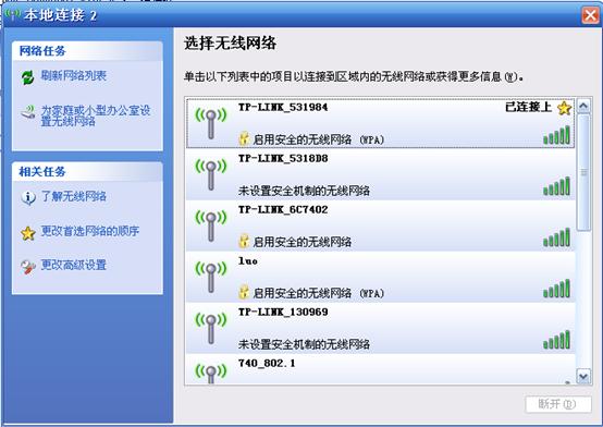 步骤7:重启完成,此时TL-WR703N的无线网络已经设置了无线安全,电脑的无线网络连接会自动断开,需要重新连接TL-WR703N的无线网络(本例中SSID为TP-LINK_531984),连接过程中需要输入TL-WR703N的无线PSK密码(就是上一步在无线参数里设置的密码),连接上之后,如下图所示。
