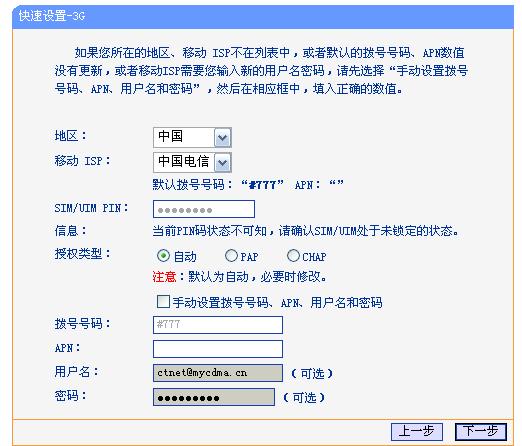 这里我们选择“3G路由模式”,点击“下一步”,配置3G拨号参数,地区选择“中国”,移动ISP:可选“中国电信”、“中国移动”和“中国联通”(根据你的上网卡制式来选择),其他默认设置不用修改。