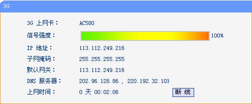 设置完成之后,点击“下一步”,重启路由器,等待1-3分钟,查看设备“运行状态”——“3G”,可以看到路由器已经获取到IP地址等上网必需的参数,说明路由器拨号已经成功,如下图,此时您就可以正常上网了。