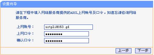步骤5:点击“下一步”,弹出上网账号及上网口令输入框,如下图所示。