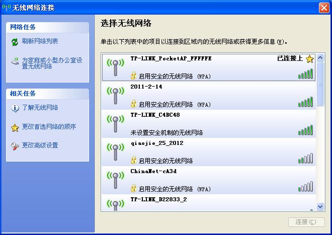 步骤7:重启完成,此时TL-WR700N的无线网络已经设置了无线安全,电脑的无线网络连接会自动断开,需要重新连接TL-WR700N的无线网络(本例中SSID为TP-LINK_PocketAP_FFFFFE),连接过程中需要输入TL-WR700N的无线PSK密码(本例为123456789),连接上之后,如下图所示。