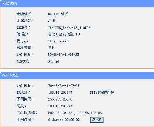 若在“WAN口状态”查看到路由器已经获取到的IP及DNS服务器地址,说明PPPoE拨号成功。