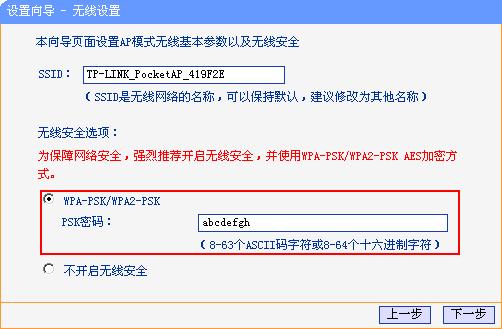 步骤4:选择“AP”,点击“下一步”,弹出无线设置页面,如下图所示。