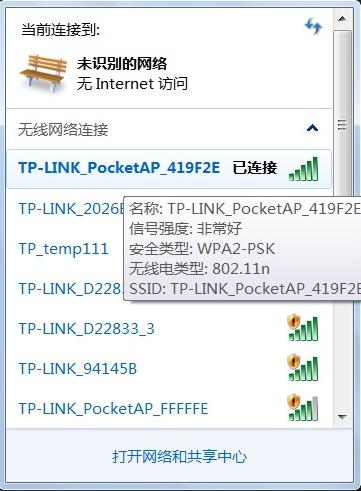 TL-WR700N默认SSID是TP-LINK_PocketAP_419F2E (“419F2E”是 TL-WR700N无线MAC地址后六位),且并未设置无线安全。电脑可以通过有线或无线方式连接到TL-WR700N(以Win7系统无线连接到TL-WR700N为例),扫描环境中的无线网络,选中TL-WR700N的无线SSID,并点击“连接”,连接上之后,如下图所示。