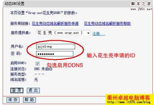 第三步:在动态DNS设置窗口中“服务提供者”里选择“花生壳”(还有一个科迈网,根据你自己选择),在“用户名”“密码”中输入你在花生壳申请的用户名密码。如果没有帐号可点击边上的注册按钮。在“启用DDNS”的选项里勾选。设置好后点击下面的“登录”按钮