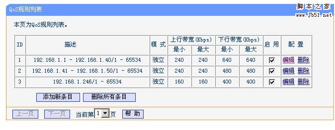 然后对QOS规则进行设置:“添加新条目”,输入IP段和端口,模式最好选择独立的宽带。