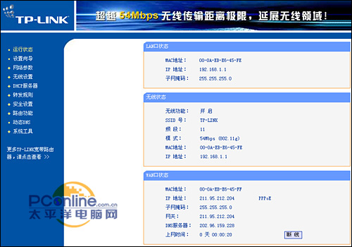 完成之后,我们在Web的页面中点击运行状态,可以看到路由器仍然没有进行拨号连接,需要我们手动点解连接之后才能接入到Internet中。连接之后,我们可以在这个页面中看到路由器中的各种状态,如LAN口状态即当前路由器的默认地址、无线状态即无线路由中的相关设置选项以及WAN口状态即接入Internet后获得的地址以及ISP供应商的网关和DNS服务器地址,并且还可以统计路由器的在线时间和控制路由器的连接状态。完成了以上这个步骤,无线路由的配置已经可以说是基本完成,本地通过网线连接的计算机以及通过无线网卡连接的计算机都可以通过无线路由而实现上网的功能,所以说配置无线路由并没有大家所想的那么抽象和复杂。