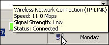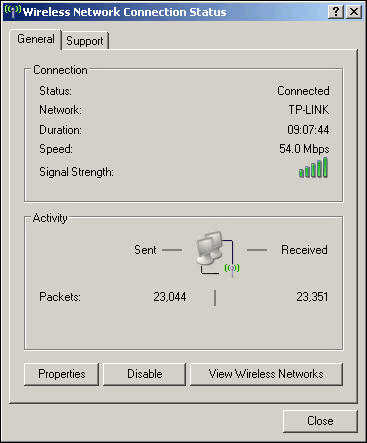 而无线网卡端的设置也十分简单,插入无线网卡之后根据提示安装相关的驱动程序之后即可使用。当用户完成配置无线路由器之后,安装有无线网卡的计算机便会自动地搜索到相关的无线网络,然后用户点击连接即可轻松地连接到该无线局域网上实现文件共享以及连接Internet的功能。当用户单击右下角无线网络状态的图标时,就会出现以上窗口,该窗口可以显示网络的连接速度以及信号的强度,虽然信号的强度并不是十分精准,但还是有一定的参考价值。在该窗口中还可以了解到通过路由器DHCP所分配到本地的地址以及路由器的网关等信息。