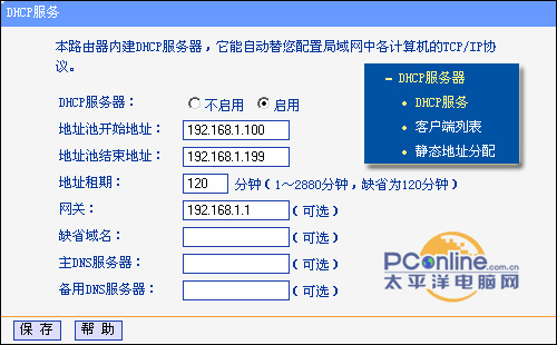 而DHCP服务器设置页面中的主要功能就是配置DHCP的相关服务,何谓DHCP呢?DHCP服务实际上就是让路由器中的DHCP服务器自动配置局域网中各台计算机的TCP/IP协议,即配置各台计算机的IP地址,计算机的本地连接并不需手动设置设置为自动获取即可。在该页面的DHCP服务选项中,可以设置DHCP服务器所分配的IP地址范围,而网关则是路由器的默认地址,而DNS服务器即是ISP供应商所提供的两个DNS服务器地址。在页面中的客户端列表中,我们可以从中了解到连接到路由器的计算机地址和名称。