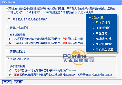而在安全设置的页面中,共用防火墙设置、IP地址过滤、域名过滤、MAC地址过滤、远端WEB管理以及高级安全设置六个子选项。选项主要是针对路由器本地的安全进行设置,如开启防火墙的开关,这是防火墙的总开关,当该开关关闭时,其子选项IP地址过滤、域名过滤以及MAC地址过滤功能将会全部失效。其中IP过滤的功能主要是限制通过路由器访问Internet的计算机所访问或者接受的数据包。而域名过滤则是限制局域网内的计算机对某些网站的访问。MAC地址过滤则是过滤局域网内的计算机对Internet的使用权。而高级设置选项中是一些关于路由器的高级安全防范设置,可以有效地防止一般的DoS攻击和网络入侵,从而实现保护路由以及本地局域网内计算机的安全。建议用户对路由的安全设置应该认真设置,建议把路由器的防火墙功能打开。