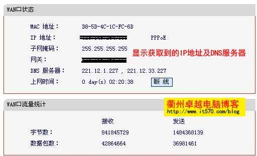 点击左侧的“运行状态”可以显示当前获取到的IP地址和DNS服务器。