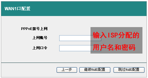 4、输入完相关信息后如果路由器上有WAN2口并且有连接网络就点击“继续WAN2配置”如果就连接了一个WAN的话就点击“跳过WAN2配置”,有部分机型只有一个WAN口的就点击完成就可以完成基本的上网配置。