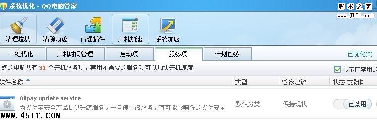 如有无360安全卫士,也可以用QQ电脑管家,打开后选择系统加速-开机加速-服务性-找到“Alipay Updater servie”设置为已禁用(如图二,三),重启电脑即可。