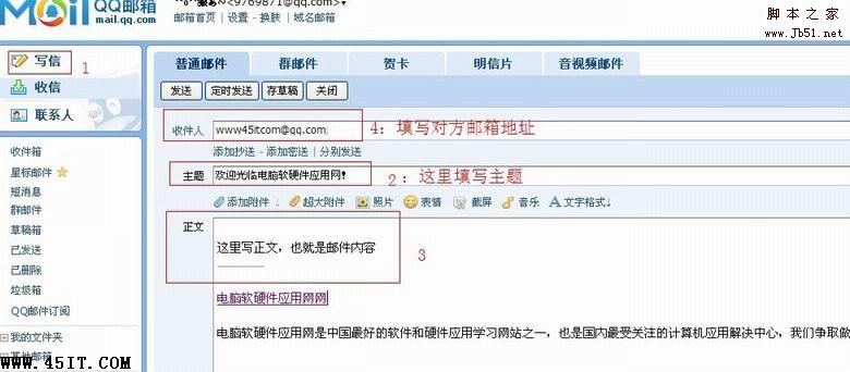 QQ邮箱设置和163是差不多的(如上图图中所示步骤),通用格式:QQ号@qq.com ,QQ邮箱格式书写和发送和163的邮箱基本上是一样的,先登录https://mail.qq.com/,也可以直接从QQ面板点邮箱图标进入,然后如上图的步骤1,2,3,4.。 1、点写信,2、写收件人的邮箱地址和主题,用的是QQ的邮箱就写如www45itcom@qq.com,新浪的邮箱就写 hihao@xina.com等。 QQ邮箱也可以直接从右边的QQ好友里点击联系人,就会自动填在收件人地址栏里。写好后点发送就可以了。