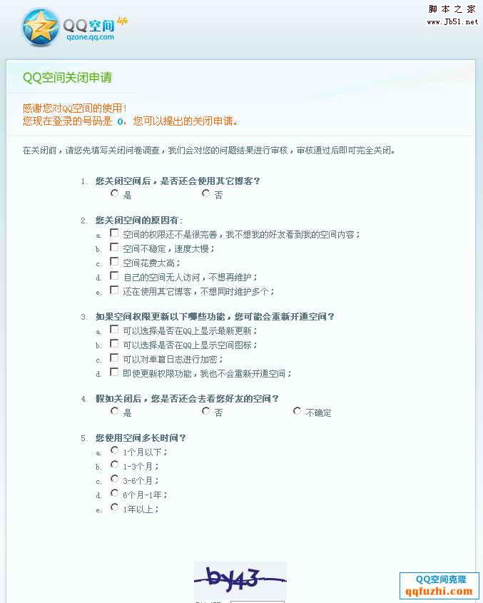 输入你的QQ号码和登录密码,然后填写相关的选项就可以了,不过关闭空间之前要想清楚喔,关闭之后,里面的日志啊,图片就全部没有了喔,不能恢复的;
