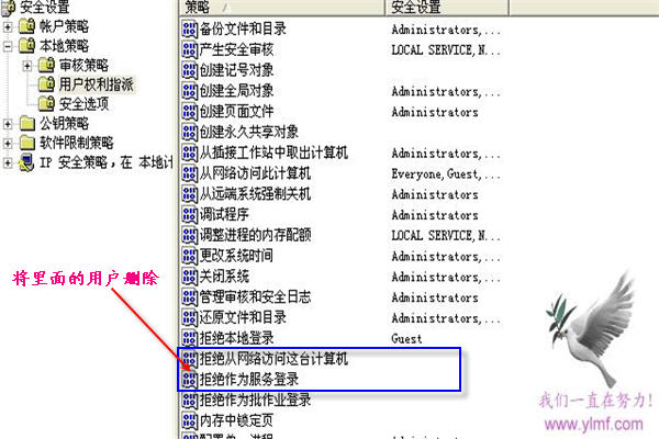 2..运行里输入secpol.msc启动“本地安全设置”-“用户权利指派”-将“拒绝从网络访问这台计算机”里面的guest用户删除。