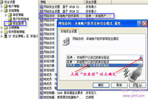 3.运行里输入secpol.msc启动“本地安全设置”-“安全选项”-“网络访问:本地账户的共享和安全模式”-将“经典”改为“仅来宾”。