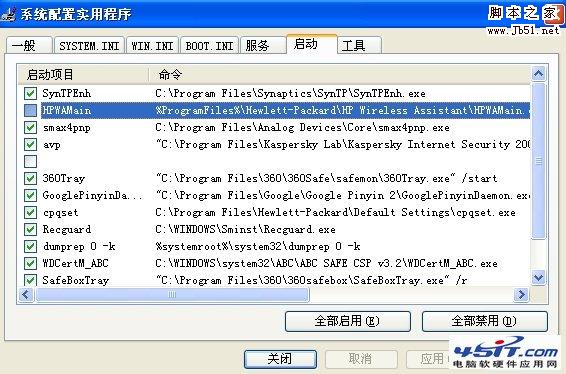 最后,在上面这些工作做完后,运行“msconfig”找到启动项,找一下你装的第三方无线网络配置管理服务,把可疑的自动启动关掉,让它不再开机启动。保存后,重启电脑,OK!这一步最关键。