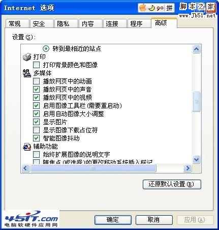 这个时候,首先打开IE的属性,也就是Internet选项,然后选高级,看看你有没有禁用flash动画,看下图:要勾上“播放网页中的动画”那个框,显示才是是正常的!