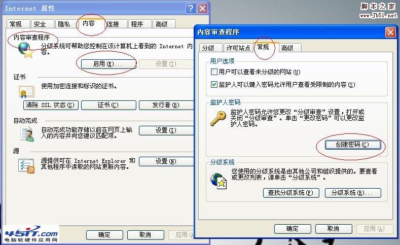 2、在【internet选项】,点【内容】会弹出内容审查程序,选择【常规】,再点【创建密码】。