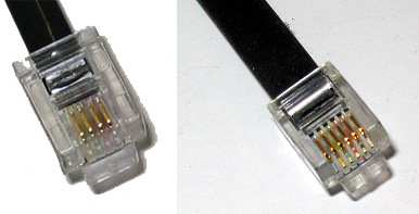 二、普通电话连接方式 电话插座多使用非国际标准的RJ11(Registered Jack,注册插孔)水晶头,有4PIN或6PIN两种,跟RJ45 8PIN水晶头相比要略小(参上图)。另外,不要把RJ11接口向RJ45接口中插接,否则可能会损坏RJ45引脚。此外,也有些转接器使用RJ45 8PIN水晶头,连接顺序只需同线序即可,具体引脚可以反观插座上的伸出引脚。