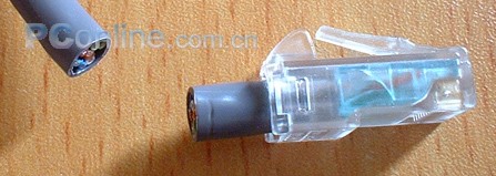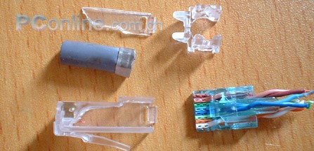 首先,双绞线从分线器的后部穿入,在十字形的导入口就按照线对分开了,白、橙入左孔;浅蓝、深蓝入上孔;浅绿、深绿入下孔;浅棕、深棕入右孔。到前端后按照白、橙、浅绿、深蓝、浅蓝、深绿、浅棕、深棕的顺序被排好,线头与前端对其后就可以插入RJ45水晶头的外壳了。这个是一个不错的改进,一下就把原来那种又掰又捏又捅的别扭工序摒弃了。而且线芯只有到了顶端才变成平面的排列,在整个接头的80%的区域仍然保持着双绞和圆形的状态,这明显比原来的百兆接头强多了。不光是制作工序上,在传输效率上也是比较大的改进。(这么多怪怪的零件,看来原来的RJ45压线钳是对它束手无策了)