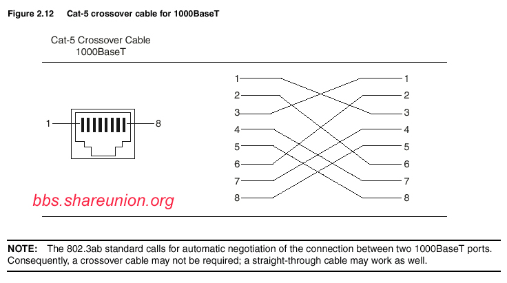 千兆5类或超5类双绞线的形式与百兆网线的形式相同,也分为直通和交叉两种。直通网线与我们平时所使用的没有什么差别,都是一一对应的。但是传统的百兆网络只用到4 根线缆来传输,而千兆网络要用到8 根来传输,所以千兆交叉网线的制作与百兆不同,制作方法如下:1对3,2对6,3对1,4对7,5对8,6对2,7对4,8对5