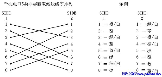 另一端:半绿、绿,半橙、半棕、棕,橙,兰,半兰千兆5类或超5类双绞线的形式与百兆网线的形式相同,也分为直通和交叉两种。直通网线与我们平时所使用的没有什么差别,都是一一对应的。但是传统的百兆网络只用到4 根线缆来传输,而千兆网络要用到8 根来传输,所以千兆交叉网线的制作与百兆不同,制作方法如下:1对3,2对6,3对1,4对7,5对8,6对2,7对4,8对5