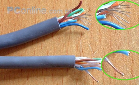 再把网线芯导线的线皮剥掉,看到不一样了吧。普通百兆线是单一根铜丝,而千兆线是每芯里面还有7根镀银线。明显的,传输效率也就高了,而且在日常的使用中,更不易折断。